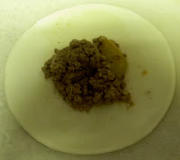 Place plantilla round on a clean surface ( I use my cutting board). Roll out plantilla slightly with rolling pin. Spoon approximately 2 Tbsp of picadillo into center of plantilla.