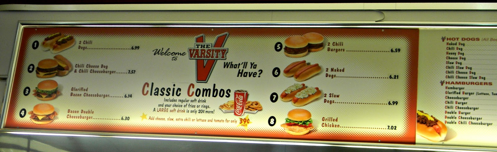 I have read about it, saw it on the Food Network, and always wanted to go there. Jorge is so good about indulging these little idiosyncrasies of mine, so he planned the day around getting to Atlanta at lunch time. If you haven't heard of it, The Varsity is the world's largest drive-in. They have been in business since 1928. Besides the food, one of the things they are famous for is the lingo. If you eat inside the restaurant (as we did), you stand in front of the counter and the staff yell, "What'll ya have?"